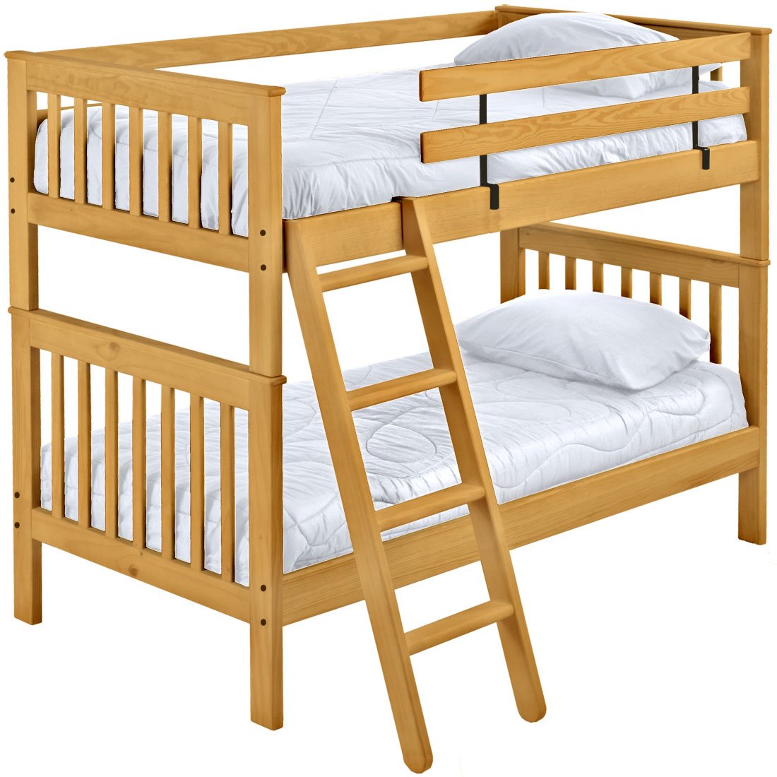 Mission bunk beds include a removable ladder that can be used on the front or ends of the bed. A full length rear guardrail and a removable front guardrail are included. Options include extra-long for big kids and a taller version to allow 8” more headroom under the bed for comfortable seating. Add optional drawers or a trundle bed for maximum use of your floor space. Ready for a mattress, no foundation required. The top of an 8” thick mattress will be 21" off the floor on the lower bed and 57” off the floor on the upper bed.