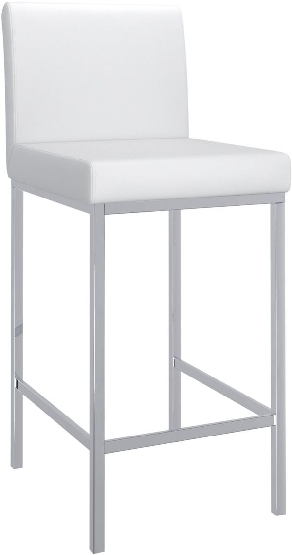 Contemporary counter height stool with faux leather and shiny chrome finishing. Combined, these two materials create a modern piece that will work will with any decor. The low back provides ample back support while adding to the minimalist appeal. Great for a casual breakfast bar or for the fancy basement bar where you can spend hours conversing with guests.Read More