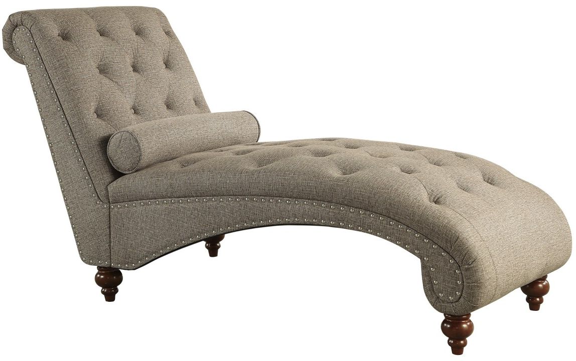 Your preference for modern traditional styling and comfort intersect in the design of the Bonne Collection. Contoured for your ultimate comfort and trimmed with traditional accents, the timeless look will be a wonderful addition to your boudoir or living room. The brown fabric covered chaise features button tufting, rolled bolster pillow, nailhead trim and espresso-finished turned wood legs. Also offered in gray.