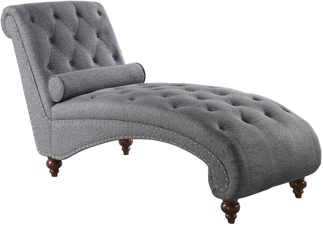 Your preference for modern traditional styling and comfort intersect in the design of the Bonne Collection. Contoured for your ultimate comfort and trimmed with traditional accents, the timeless look will be a wonderful addition to your boudoir or living room. The gray fabric covered chaise features button tufting, rolled bolster pillow, nailhead trim and espresso-finished turned wood legs. Also offered in brown.