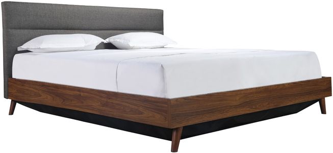 Footboard and rails feature a 3D foil laminate faux walnut wood finish to contrast with upholstered headboard