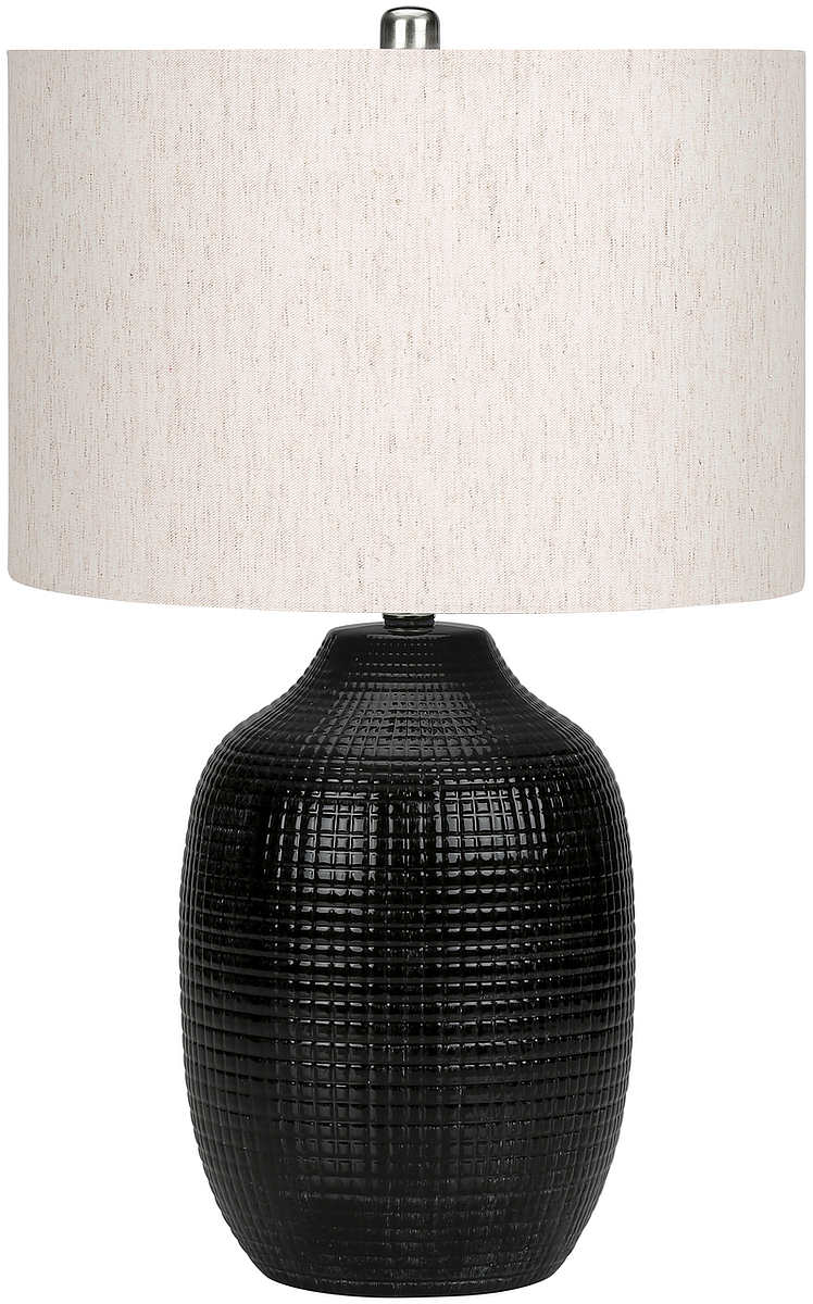 Add a casual elegant ambiance to your living room, home office, or bedroom with this stylish and fashionable 26"H table lamp. This ginger jar shaped lamp features a glazed black ceramic base with a geometric texture and a linen ivory shade, finished with a silver finial on top.Read More