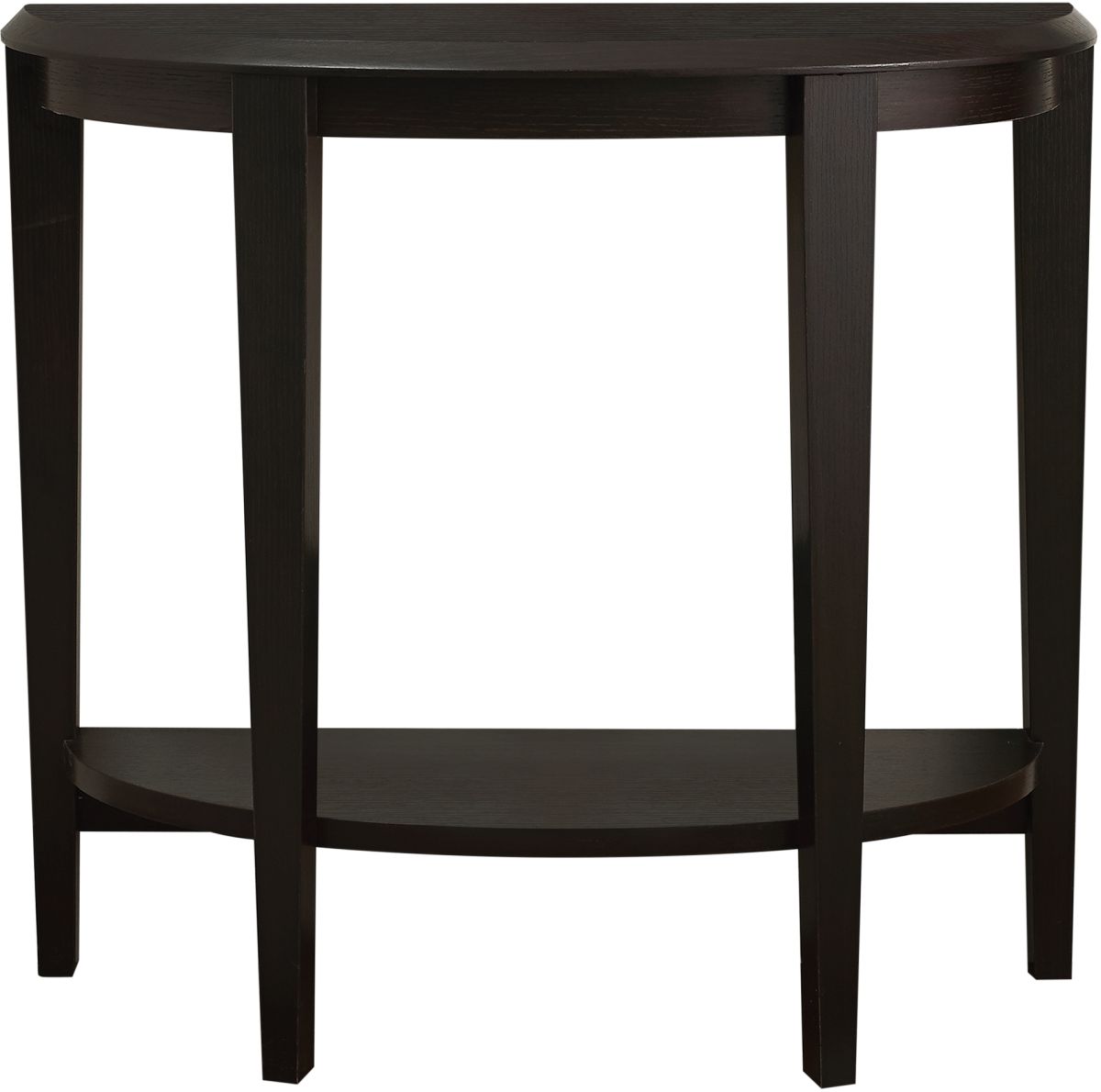 Add a stylish touch that will complete your living space with this sleek, transitional style hall console table finished in a warm cappuccino. The curved half-moon shape is complimented by the sturdy tapered legs. Ample surface area and a two-tiered design make this console table perfect for displaying your favourite decorative items.