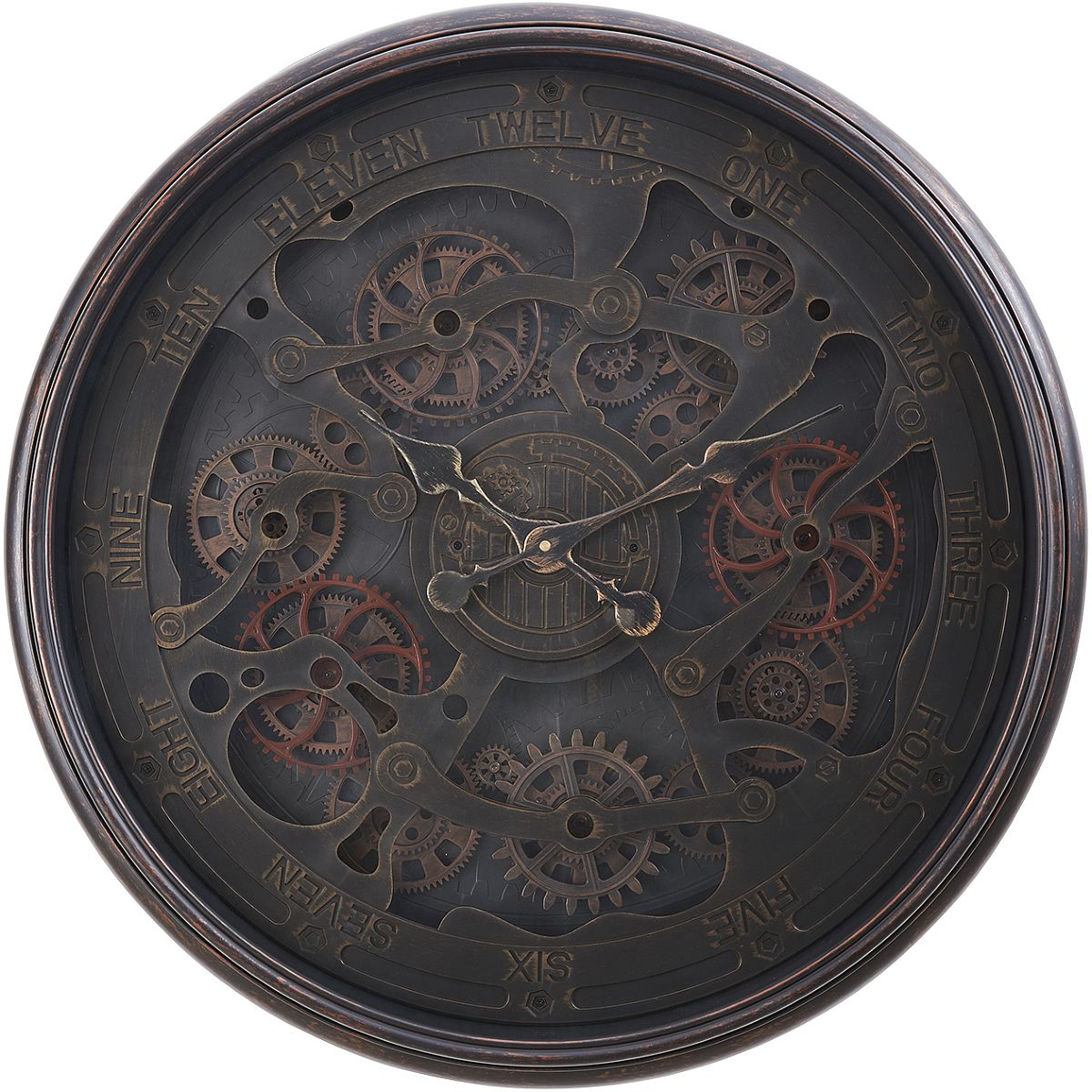 Add some sophistication to your home decor with this stunning 30" round wall clock with an exposed gear mechanism. The sleek black plastic frame on this large, oversized clock surrounds a clear glass surface showcasing the metal gears in motion, for a stylish look to any home decor.Read More