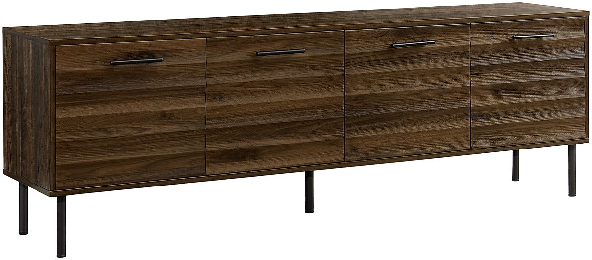 Add some fashionable flare to your entertainment space with this sleek and stylish 72 inch tv stand in a rich dark brown laminate wood-look finish on all sides. Designed for the trendiest customers, this mid-century, transitional console features 2 spacious storage cabinets with a rippled front design and an adjustable shelf inside each cabinet, perfect for keeping your media essentials organized and out of sight.Read More