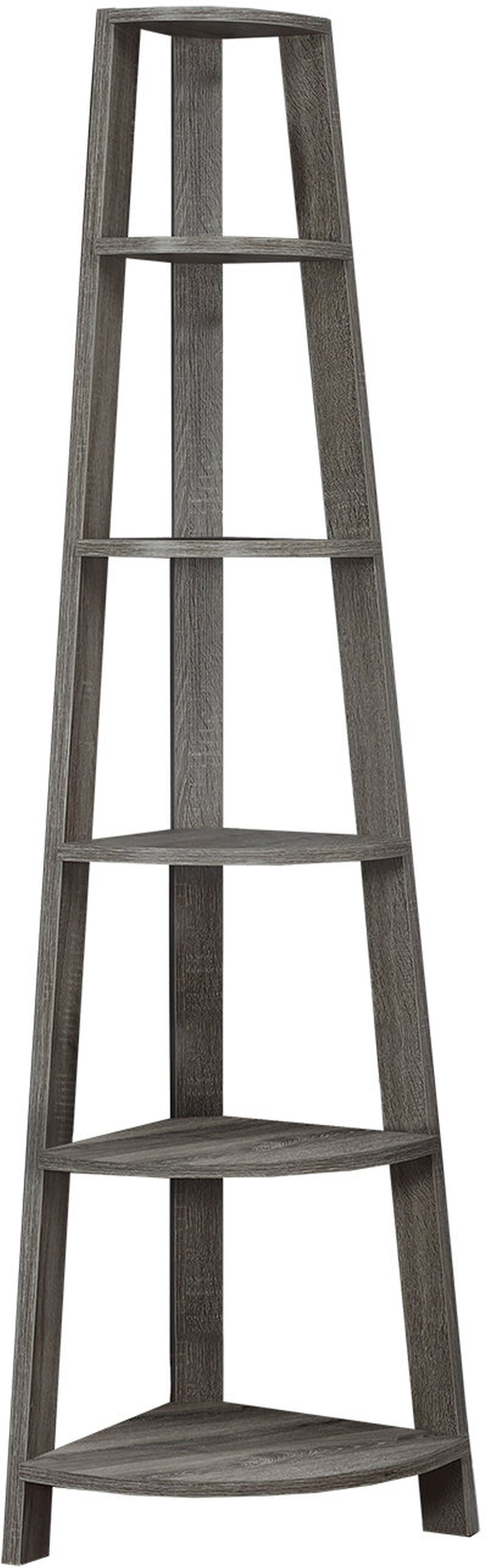 Set up this etagere bookcase easily and let it do its thing! Look how nice the bookcase fits in a corner of your living room, office or bedroom, allowing you to showcase books and all types of decor easily. Make use of a spot that is often tough to work with: the corner. Maximize storage and display with a modern piece that will be sure to help you utilize all the space available to you thanks to 5 fixed tray style shelves. Three sturdy beam legs ensure structural integrity to this corner ladder shelf in a taupe colour finished in a reclaimed wood texture. Anti-tipping hardware is included for further stability.
