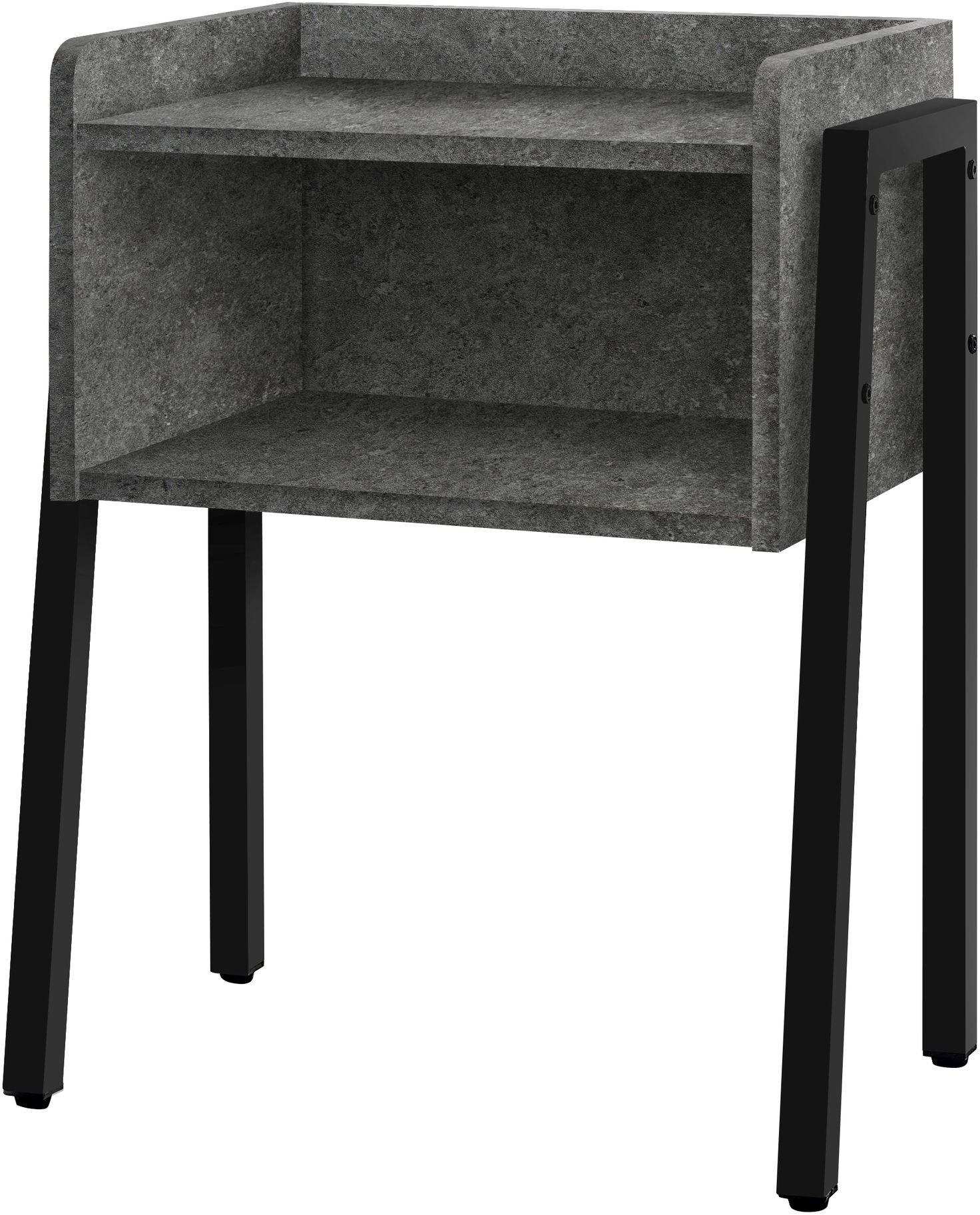 Save space while providing the perfect sidekick to any furniture ensemble. This end table, featuring a grey stone-look, is equipped with an open shelf and modern black metal legs to complete the industrial-inspired design. Made for showing off your favourite decor items or storing books in the living room or family room, this side table can also be used as a bedside table. It is an on-trend piece that is waiting to be added to any living space. Assembly is required.