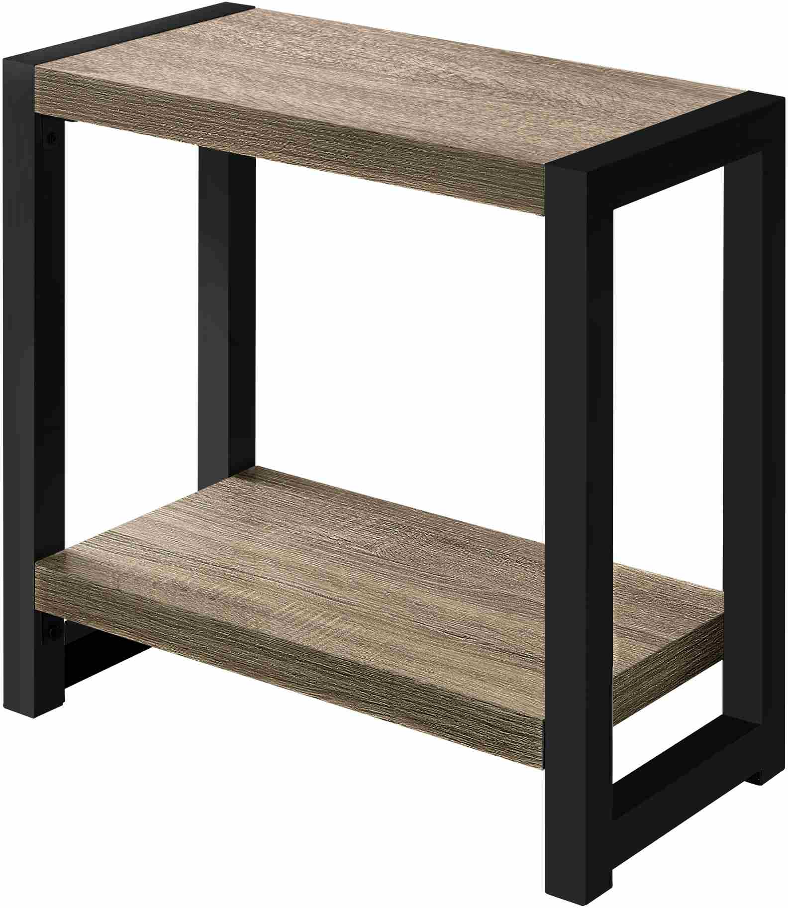 Here's an accent table that holds its own. With its thick tabletop, bottom shelf, and black metal legs, this robust side table stands strong next to a sofa, chair, or bed. Finished on all sides, it can be positioned in any direction to fit both narrow and wide spaces. The two tiers in a dark taupe wood-look finish with a wood-grain texture have ample surfaces to display items in your living room or bedroom. Boasting a clean, contemporary style, this rectangular end table coordinates with any décor.
