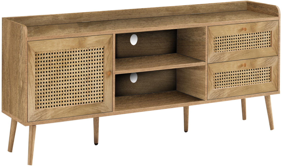 This media entertainment center includes 1 closed storage cabinet and 2 drawers with elegant rattan paneling and wooden knobs, to store media accessories