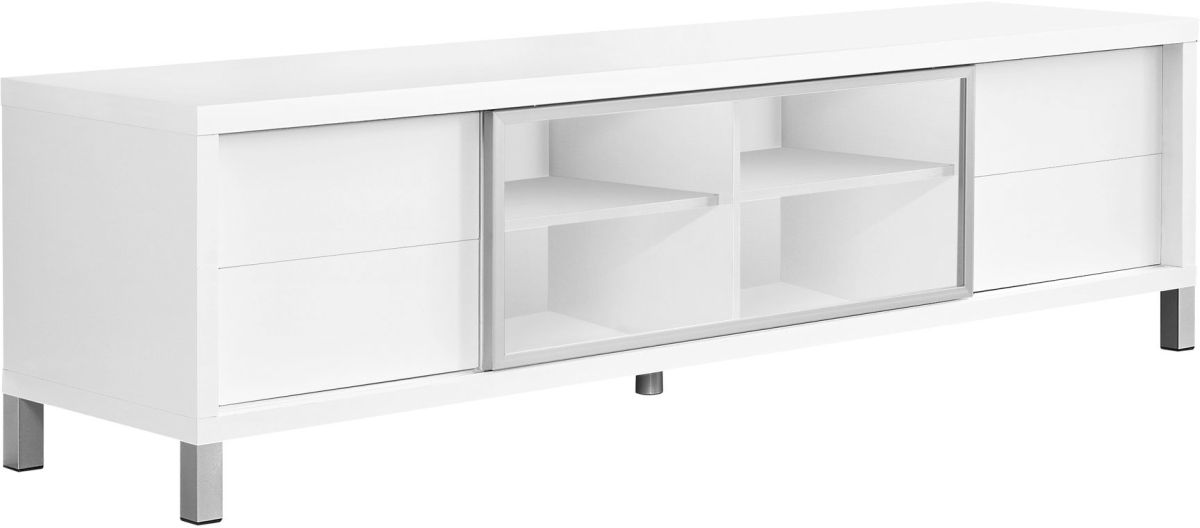Create a European look to your living space with this contemporary bright white TV console. The thick paneled frame paired with a tempered glass center sliding door is supported by stylish sleek silver legs and 2 pre-drilled capped wire management holes in the back panels. Featuring 4 storage drawers and 2 adjustable center shelves, this TV stand will meet all your media storage needs in style.Accommodates all TV sizes with a center stand.