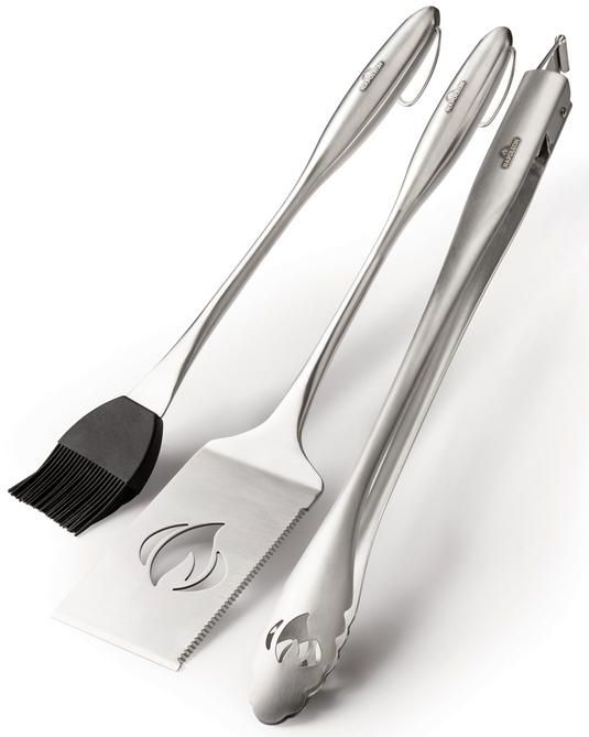 Elegant and easy to use Napoleon's PRO Stainless Steel 3 Piece Toolset has everything you need to master your next barbecue. The curved handles sit lightly and comfortably in hand while you grill up a feast. Easily hang your PRO Stainless Steel 3 Piece Toolset with the oversized loops for storage on your grill's tool hooks. The spatula features an extra long face, bladed tip, and serrated edge for easy moving and flipping. The tongs are sturdy, easily locking and unlocking so you're always ready for BBQ action. The silicone basting brush lets you safely slather on the sauce, and cleanup is a breeze because it's dishwasher safe.Read More