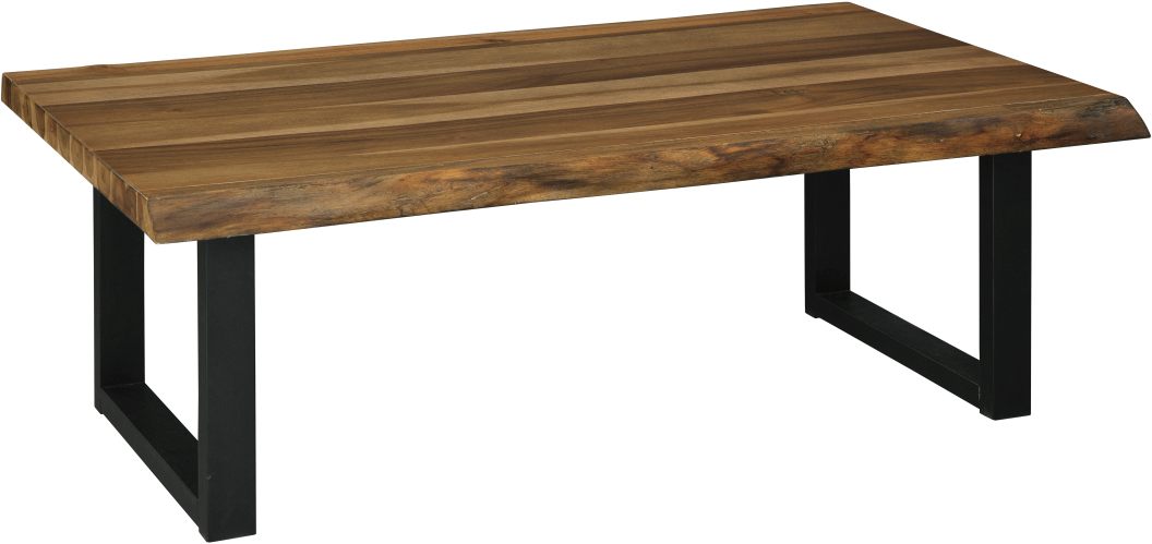 This Brosward end table offers an exposed metal frame and an acacia wood block top in a replicated live edge design and glossy finish.