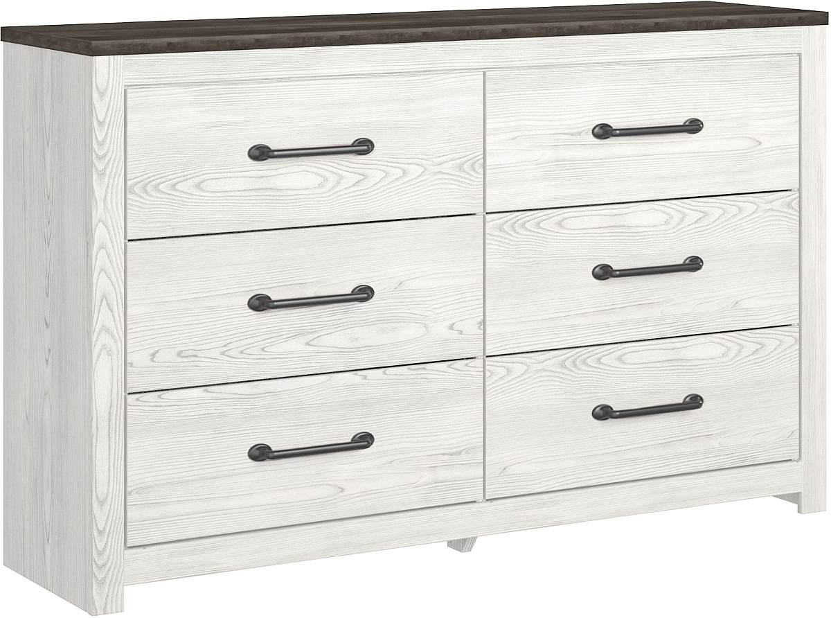 Cool, clean and casually modern. This dresser’s wispy whitewash and gray finish sets the tone for your calming sanctuary. Large linear pulls add dimension and authenticity. Six smooth-gliding drawers neatly accommodate your wardrobe needs.
